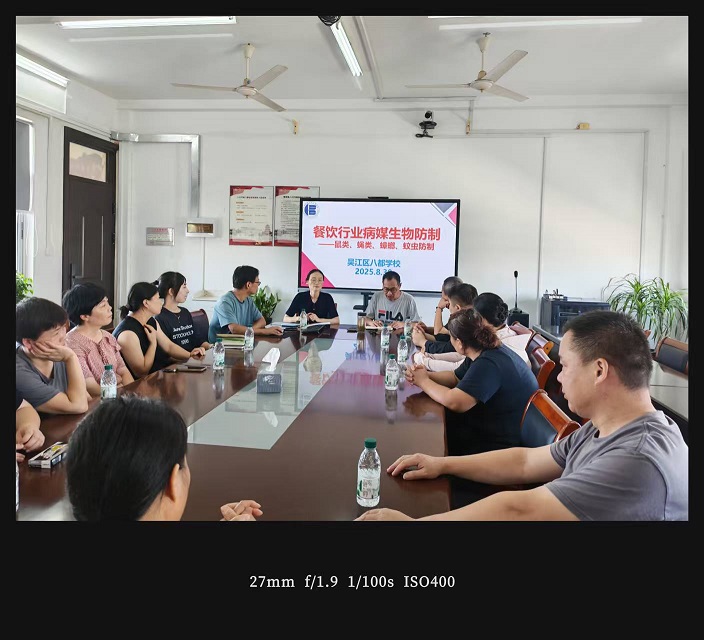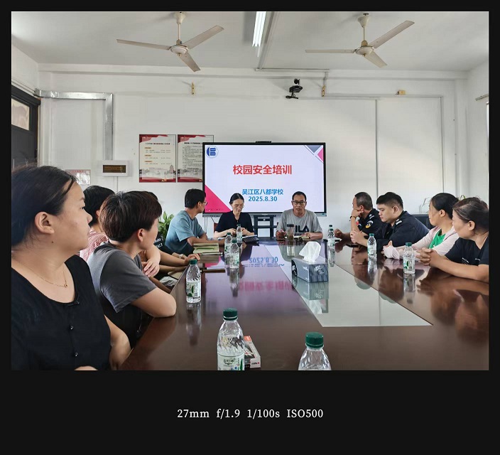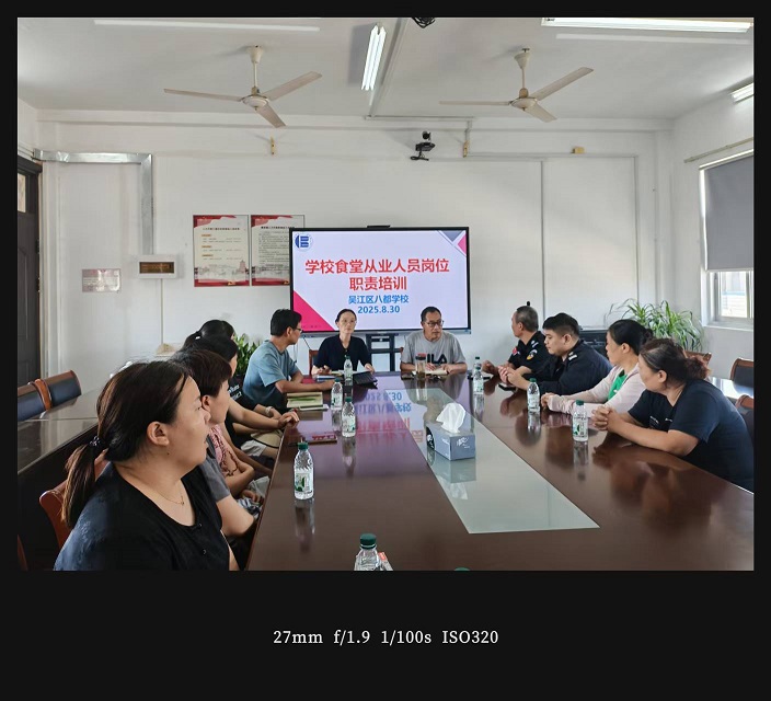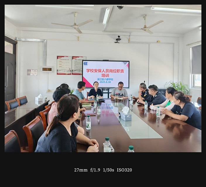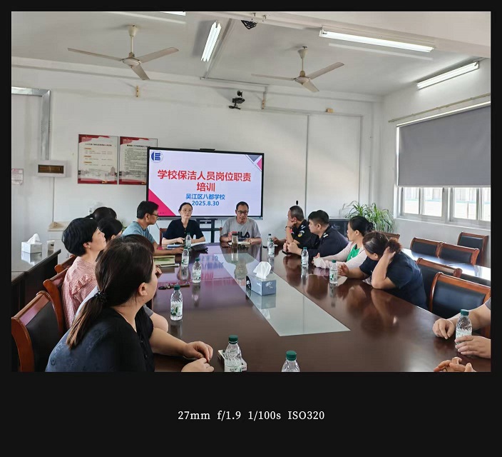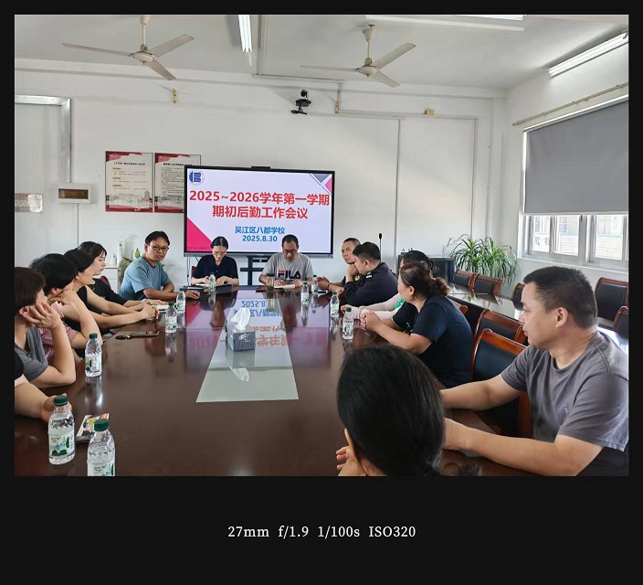 8月30日中午12:30在八都学校中学部慎思楼三楼会议室召开2025-2026学年第一学期期初后勤工作会议,会议由总务处杨国其主任主持,戚小冬副校长布置本学期具体工作,陆慜校长作总结发言,最后由总务处对食堂从业人员、保洁及门卫保安进行相关培训。