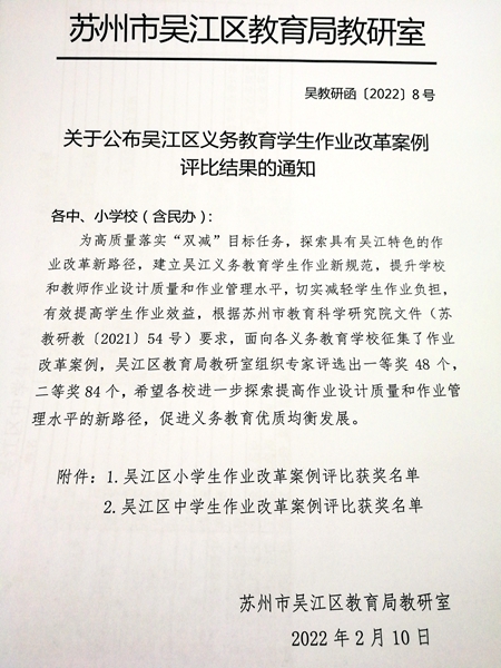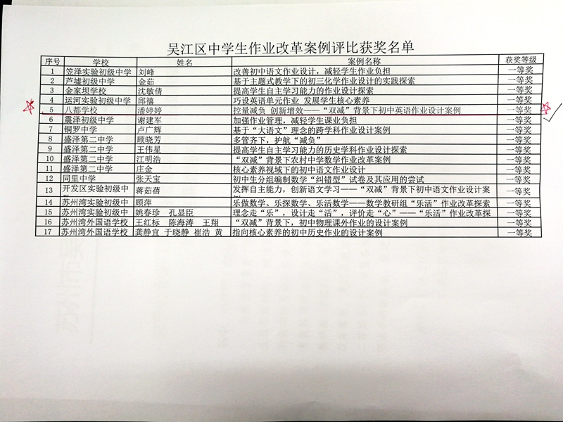 我校潘婷婷老师获吴江区义务教育学生作业改革案例评比一等奖