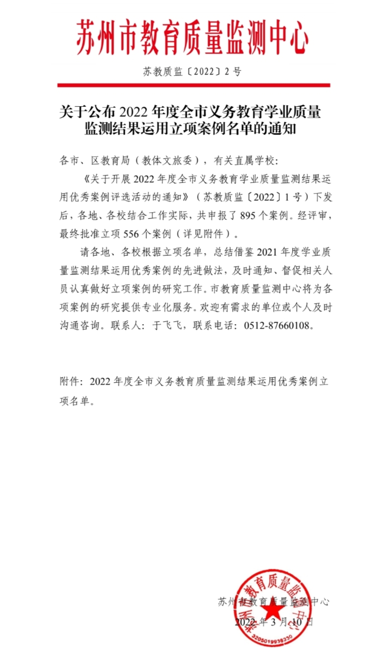 根据《关于公布2022年度全市义务教育学业质量监测结果运用立项案例名单的通知》,
