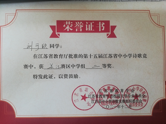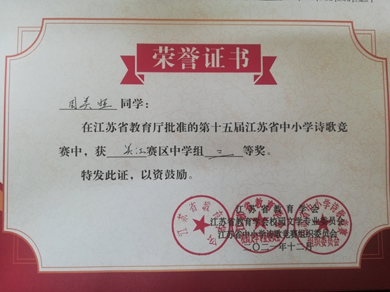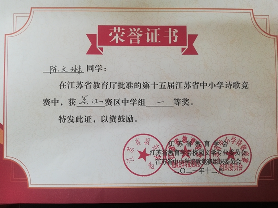 喜报:我校陈文琳等同学在江苏省第十五届中小学诗歌竞赛中学组比赛中获奖