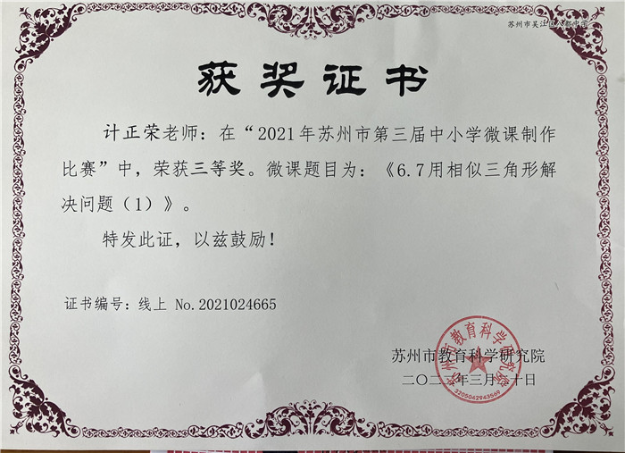 我组计正荣老师获2021 年苏州市第三届中小学微课制作大赛三等奖