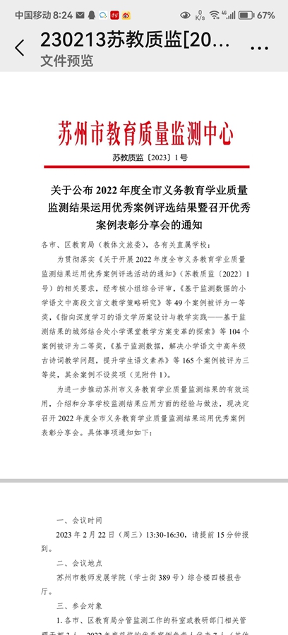 我校吴斌峰副校长获苏州市义务教育学业质量监测结果运用案例评选二等奖