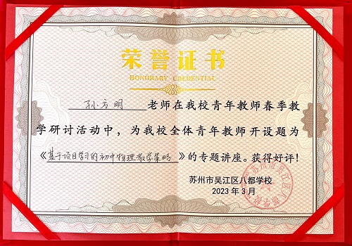 吴江区学科带头人、吴江区七都中学德育处主任孙方明老师专家讲座证书
