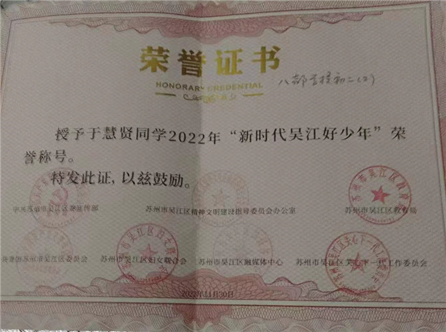 我校初二(2)班的于慧贤同学荣获“新时代吴江好少年”称号。