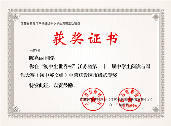 喜报︱我校陈嘉丽同学在江苏省第22届中学生阅读写作大赛中荣获中学英文组二等奖