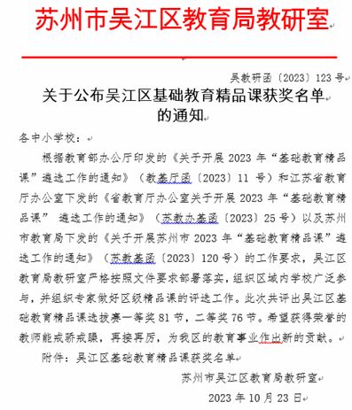 喜报 | 我校朱舒雁、腾菲老师获吴江区基础教育精品课比赛一等奖