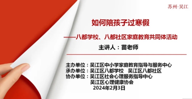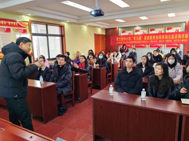 活动首先由国家二级心理咨询师,吴江区心理健康协会儿童青少年心理专委会主任委员,苏州市资深儿童青少年心理咨询师和家庭教育专家苗老师为家长开设题为“如何陪孩子过寒假”专题讲座。他围绕假期中家长面临的一些常见的教育问题“如何帮助孩子在寒假当中合理使用手机”“如何帮助孩子一起合理规划寒假作业”“如何帮助孩子合理规划压岁钱的管理”等方面给家长支招,为家长献策。