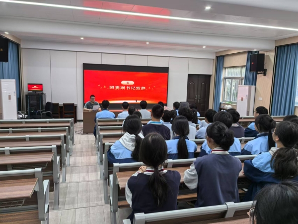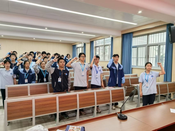 紧接着,是本次仪式的重头戏——新团员宣誓。在鲜艳的团旗下,20余名新团员身着整齐的校服,右手握拳,面向团徽,庄严宣誓:“我志愿加入中国共产主义青年团,坚决拥护中国共产党的领导……”铿锵有力的誓言,回荡在阶梯教室的每一个角落,表达了他们加入共青团组织的坚定决心和崇高理想。