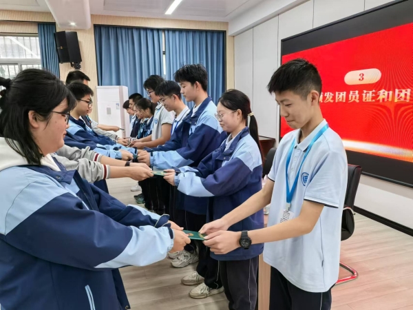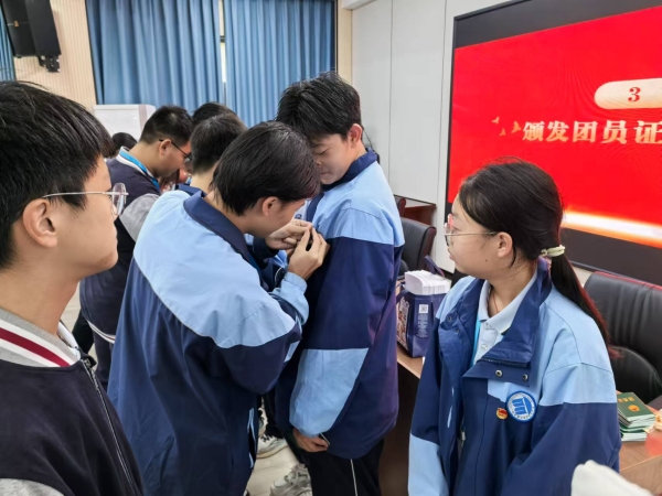 宣誓完毕后,老团员代表向新团员赠送了团徽,并亲手为他们佩戴上这枚象征着荣誉与责任的标志。新团员们佩戴着团徽,脸上洋溢着自豪与喜悦,这一刻,他们正式成为了共青团大家庭的一员。