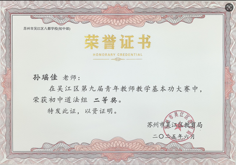祝贺我校孙瑶佳老师获吴江区第九届青年教师教学基本功大赛二等奖!