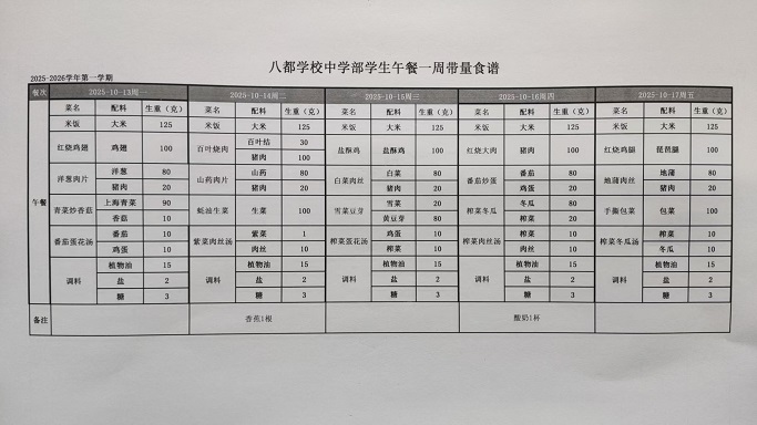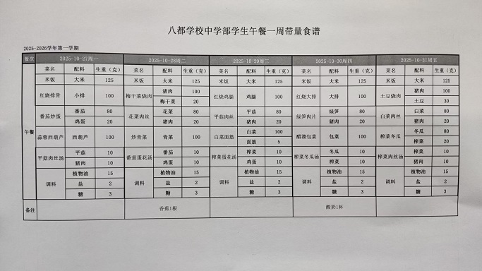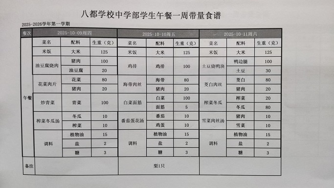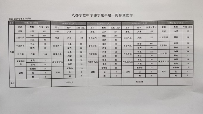 2025年八都学校中学部10月学生午餐带量菜谱