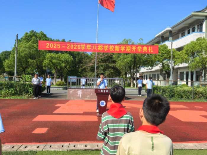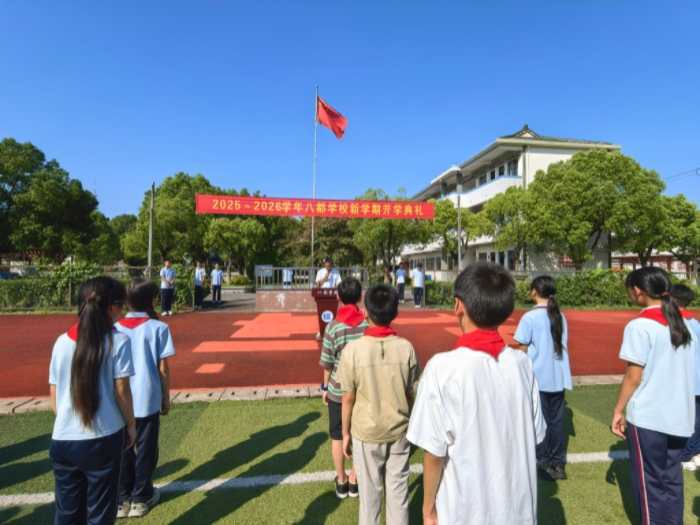 清晨,全体师生齐聚操场,庄严肃穆地举行升旗仪式。鲜艳的五星红旗在激昂的国歌声中冉冉升起,迎风飘扬。