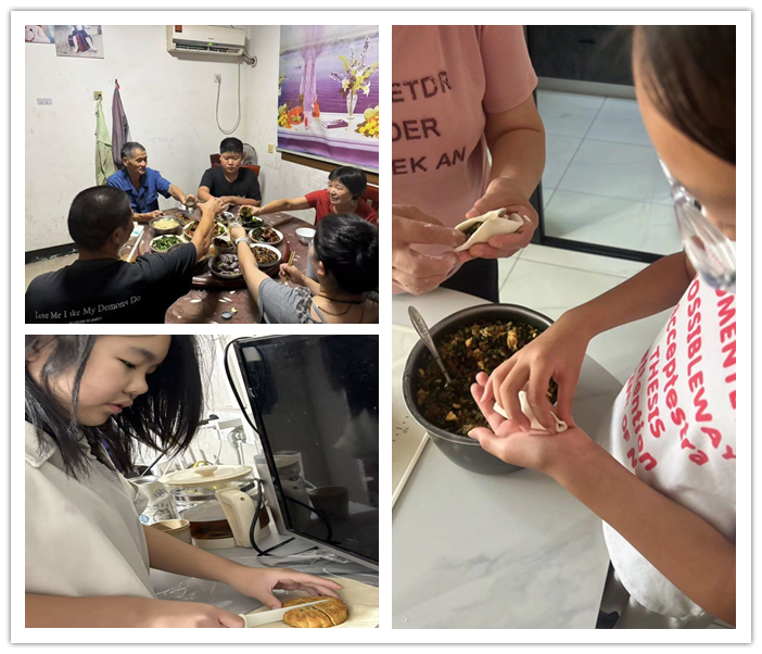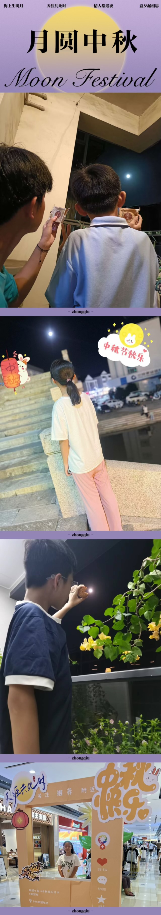 中秋作为阖家团圆的节日,在各班班主任的提议下,同学们在家里的中秋活动也不少。同学们们和家长们一起行动,一起吃团圆饭,一起品尝月饼,一起看中秋晚会,一起赏月……,笑声不断、情谊满满,这就是中秋的阖家欢乐呀!