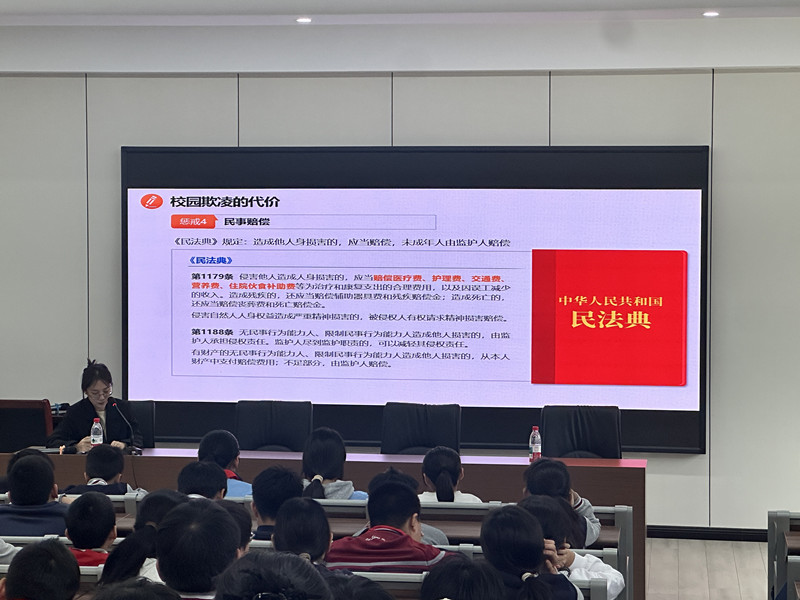 随后,丁律师以鲜明的主题、详实的内容、鲜活的案例、专业的分析,为孩子们拨开校园欺凌的迷雾,指点破解欺凌的迷津。丁律师向同学们明确殴打、辱骂等校园欺凌形式,带同学们解读了新修订《治安管理处罚法》相关条款,强调违法必惩原则,随后分析欺凌高发时段区域、欺凌产生的双方危害及从批评教育到刑事责任的层级惩戒。为让法律条文与危害的分析更易理解,她结合五个真实案例深度剖析,鲜活事例让同学们直观感受校园欺凌的惨痛代价,深受触动与警醒。讲座尾声,丁律师倡议全体同学勇敢向欺凌说 “不”,现场组织观看校园欺凌应对视频,同时郑重提出 “不做欺凌者、不做旁观者” 的倡议与要求。