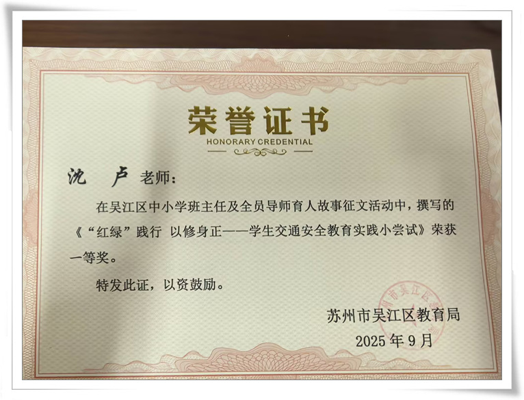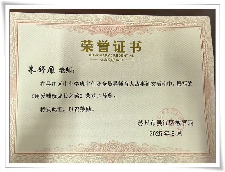 为深入贯彻落实立德树人根本任务,充分展现我区班主任及全员导师的育人智慧和师爱情怀,进一步弘扬教育正能量,区教育局决定开展“爱润成长”吴江区中小学班主任及全员导师育人故事征文评选活动。我校沈卢、朱舒雁两位老师参加了本次评选活动,并分获一等奖和二等奖。
