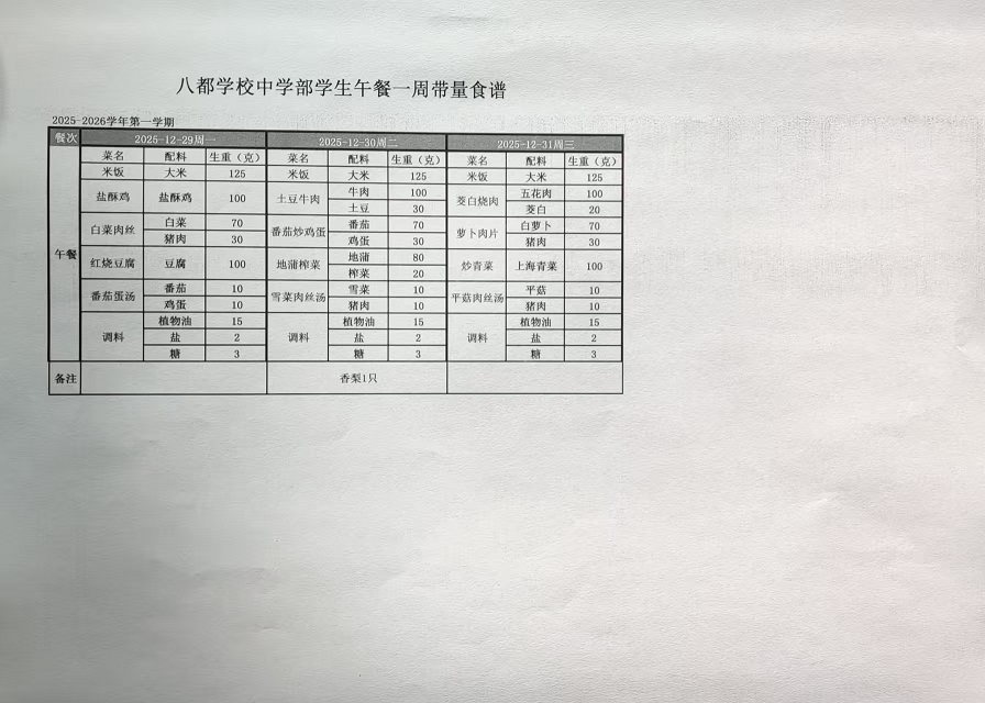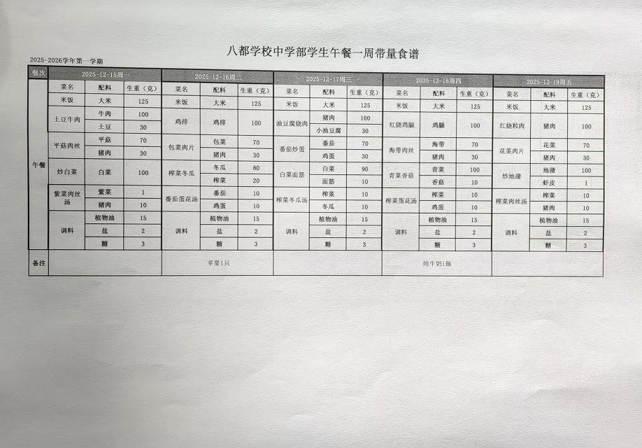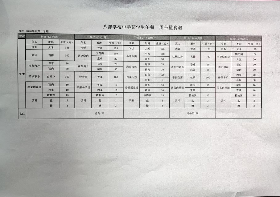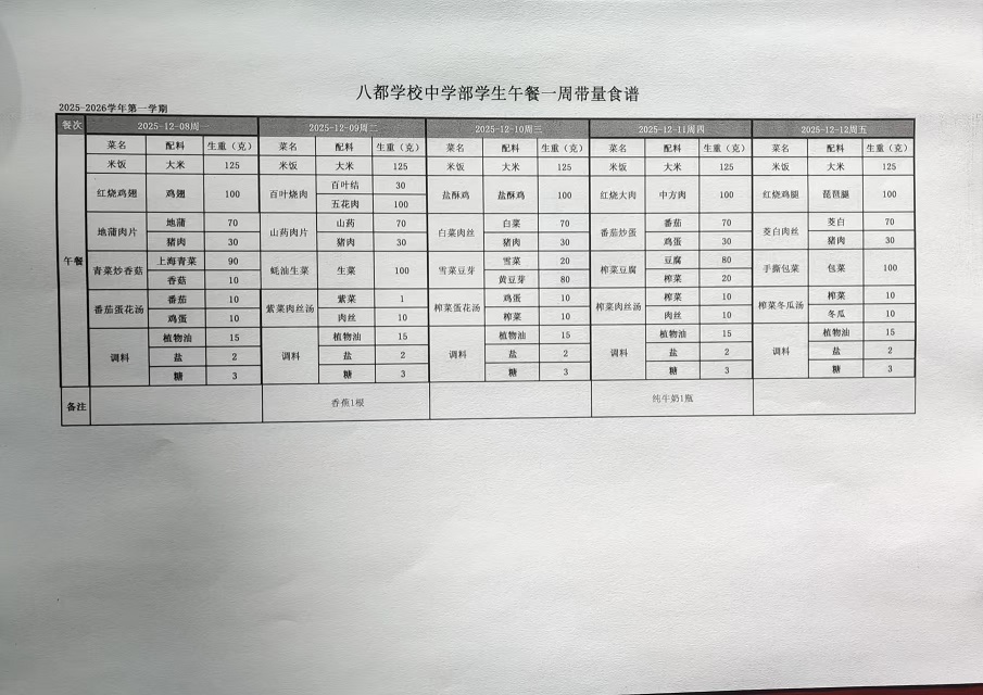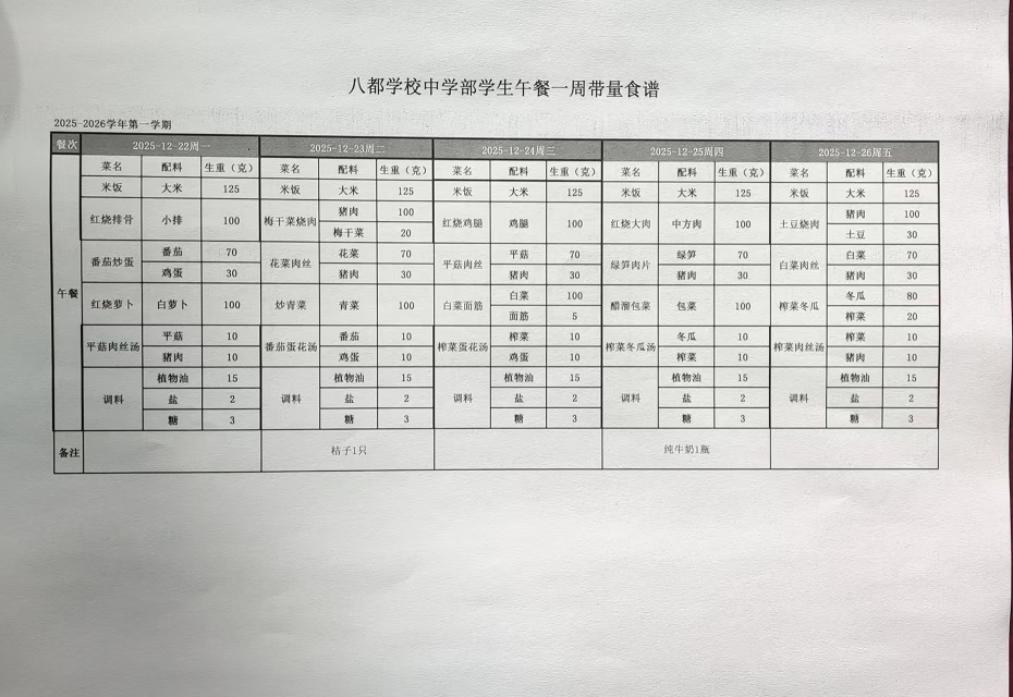 2025年八都学校中学部12月学生午餐带量食谱