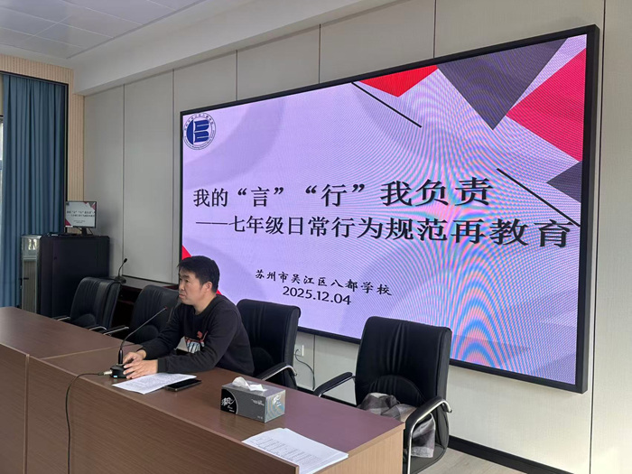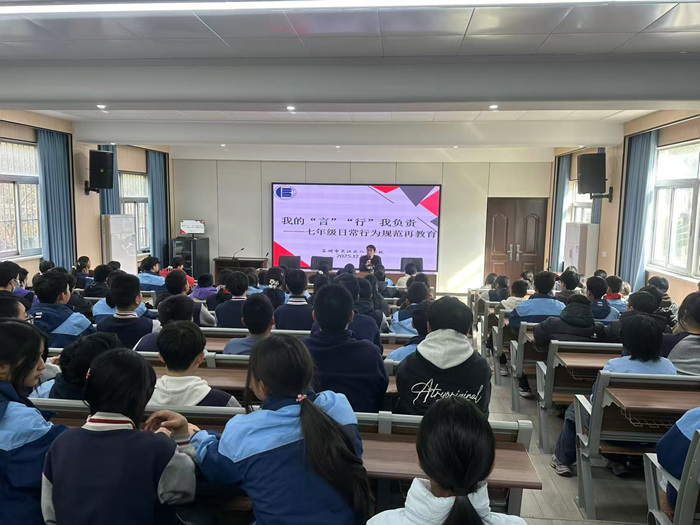 为进一步加强七年级新生行为习惯养成教育,营造文明、有序、和谐的校园氛围,12月4日中午,学校德育处主任沈卢老师在阶梯教室为全体七年级学生带来了一场主题为“我的言行我负责”的日常行为规范再教育专题讲座。