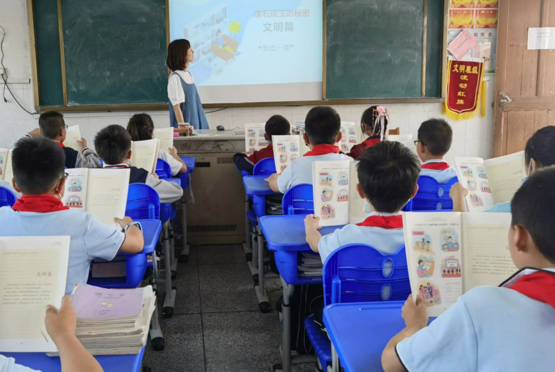 6月4日的晨会课上,教师与学生一起共同学习了文明篇《到此一游》。老师引导学生从课本中的故事出发,辩一辩故事中人物的行为是否文明?然后让学生联系生活,交流自己生活中见到的一些不文明现象,并谈谈如果见到这些不文明现象该怎样做?再由彼及此,说说自己曾今做过的不文明行为,反思今后的做法。在学生的说一说、辩一辩、自我反思中,“行文明事,做文明人”这一价值观深入学生心中。