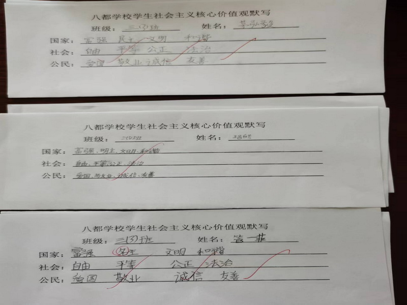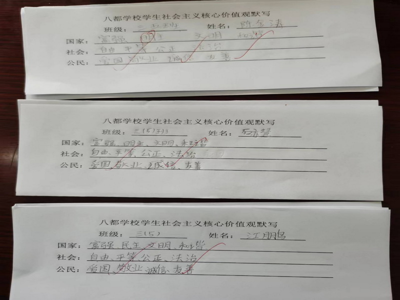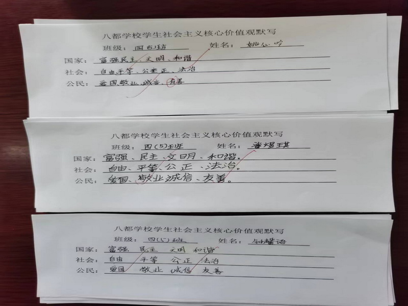 6月14日下午,德育处赵明卫老师随机走访了几个班级,对学生的“社会主义核心价值观”内容进行了抽测默写。赵老师把事先准备好的默写内容随机发放给班级的两组学生,让学生默写。抽测的班级是随机的,学生也是随机的。通过后来的批改,还是发现了不足,部分同学出现了错别字,如“民主”写成“明主”、“友善”写成“有善”等,总体上默写质量较好。本次抽默的班级是三(3)班、三(5)班和四(5)班。
