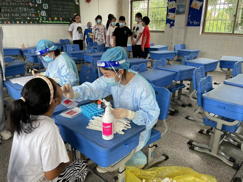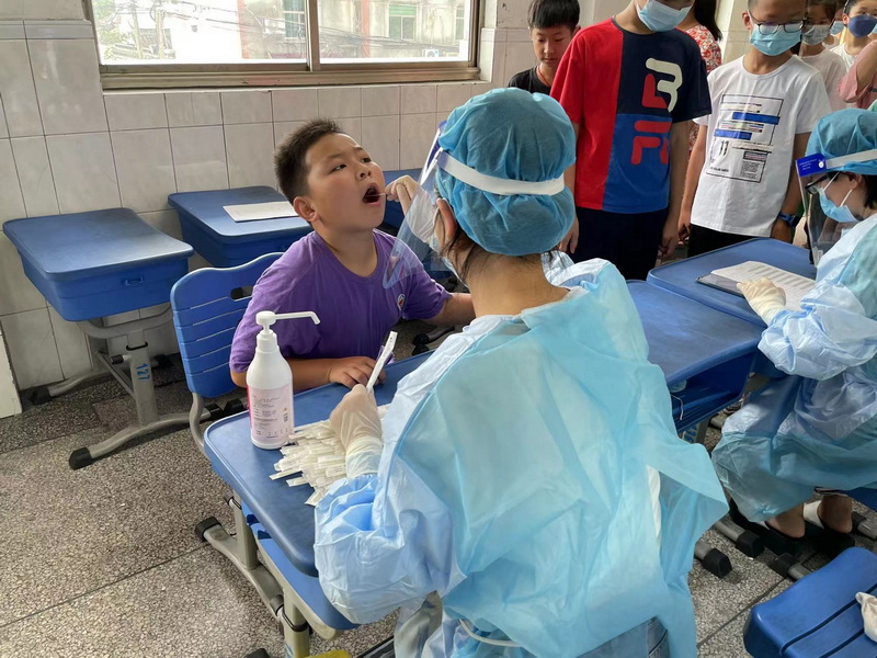 7月6日上午八点,震泽镇第二中心假日学校核酸检测准时开始。两位志愿者按标准穿戴好防护服,冒着酷暑按标准流程给五年级的全体学生进行了核酸检测。
