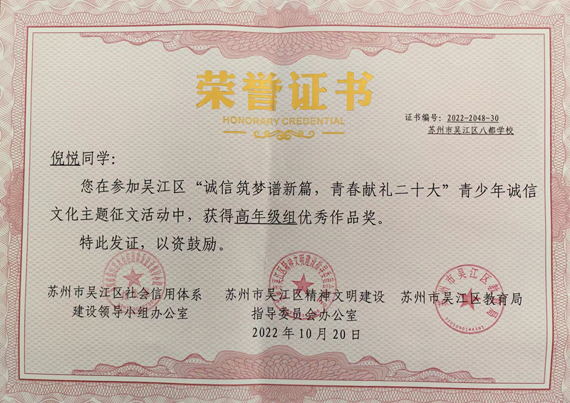 喜报:倪悦同学在“诚信筑梦谱新篇 青春献礼二十大”征文中荣获优秀作品奖