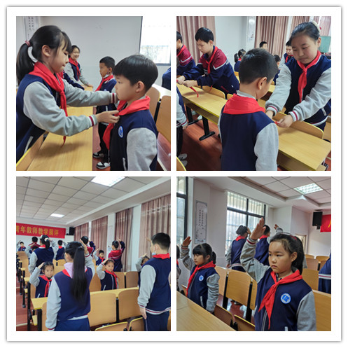 10月13日中午,高年级的哥哥姐姐们为二年级的预备队员们戴上鲜艳的红领巾,并纠正预备队员们的队礼,队姿。