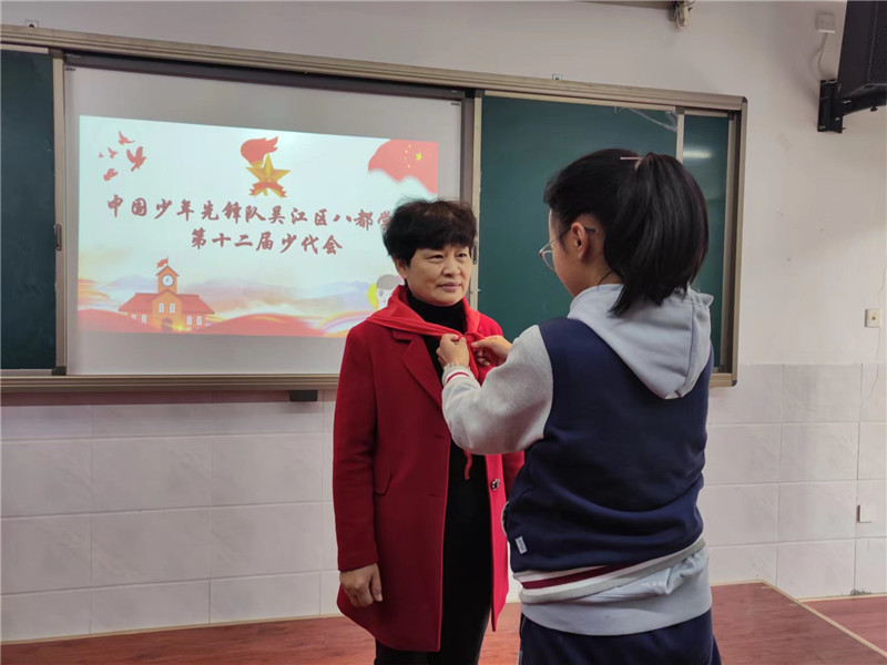 经过激烈的竞选,在20名候选人中产生了10名大队委理事会成员。钮建国校长为成功入选的大队委员们佩戴上标志,并祝贺八都学校新一届大队委员们。退休老教师沈美玲老师佩戴了少先队员代表授予的红领巾走到司令台前,庄严地举起右手,带领新一届大队委成员面向队旗重温入队誓词。队员们精神振奋,用激昂的誓言、铿锵的呼号,表达了大队委们感党恩、听党话、跟党走的坚定理想信念和真挚情感。