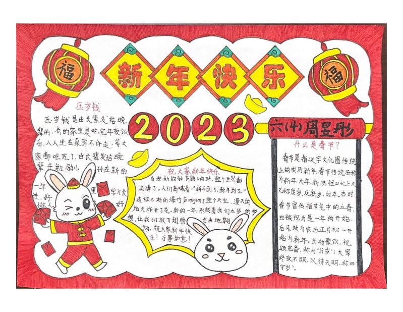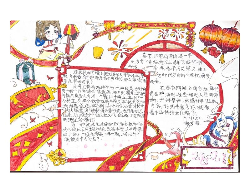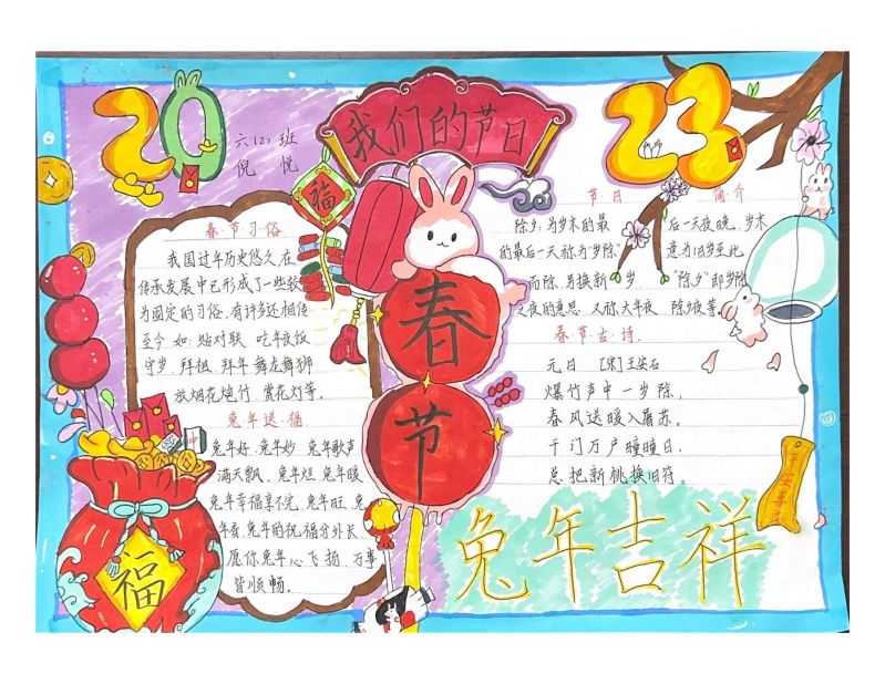 为使学生深入了解春节的文化内涵,大力弘扬中华传统文化,八都学校三——六年级开展“我们的节日——春节”手抄报评比活动。本次活动的目的是在寒假和春节期间,让学生近距离感受中国的传统节日文化,增强民族自豪感和自信心。