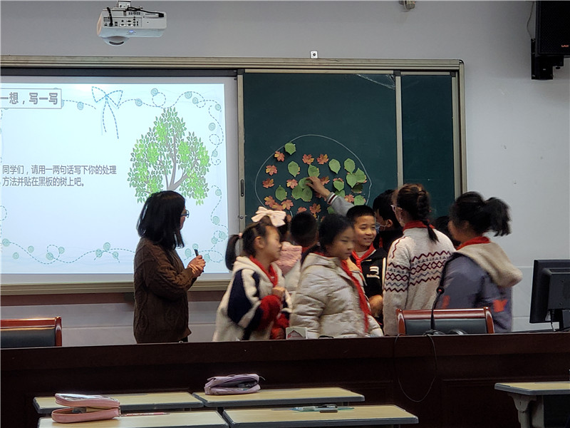 曹李雯老师首先出示残奥会视频,让同学们说说自己的感受,从而引出课题:挫折,让我们更坚强!然后让学生在黄色树叶上写下自己的挫折,通过分享讨论把挫折归类成三个方面:在学习上,生活上和人际关系上。接着,以表演的形式把三方面的挫折案例进行展示,经过小组讨论、全班交流总结解决挫折的方法,同时让学生思考写下自己挫折的解决办法。最后,一首诗歌作为结束。