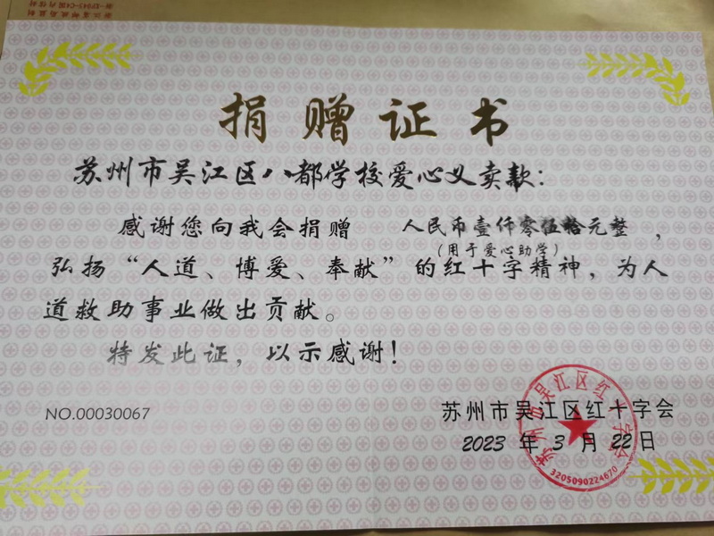 全体师生通过爱心义卖,将义卖款中的一部分捐赠给区红十字会,通过区红十字会“爱心助学”项目资助贫困生。
