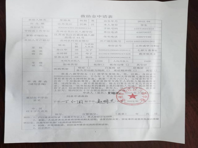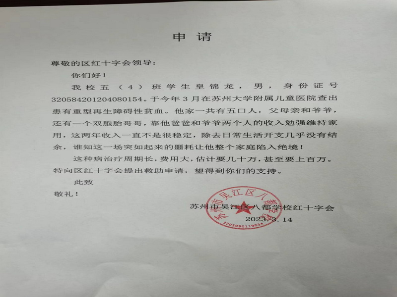 区红十字会工作人员在得知我校五(4)班的黄某某身患重症后,第一时间联系我校红十字会的赵明卫老师,表示可以为该同学争取一笔爱心资助款,因为该同学几年前参加过学校红会举行的“爱心一元捐”活动。学校红会的赵明卫老师马上联系该生家长,组织材料。经过近一周的材料组织、公示等环节后,该生家长已拿到爱心款。为进一步的治疗和康复打下了基础。