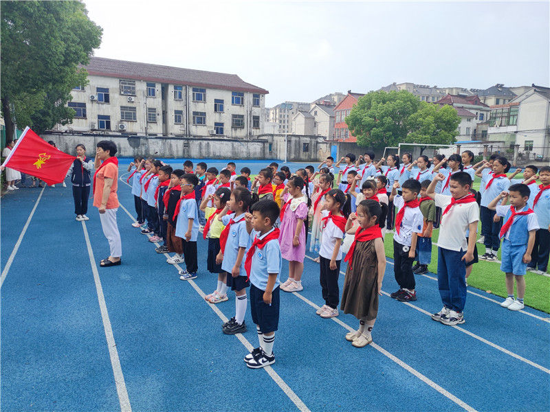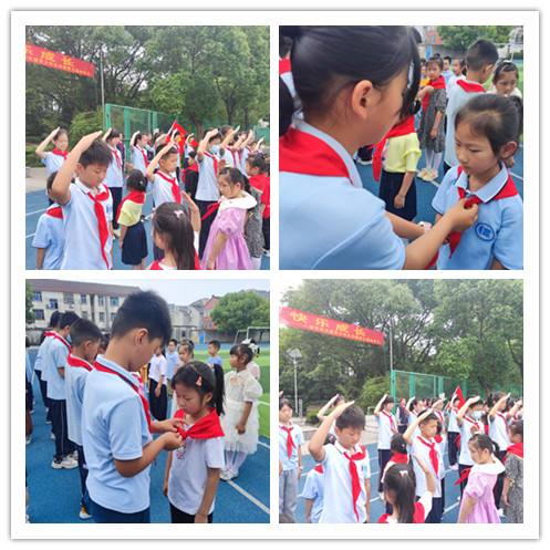 新队员们高举右拳,在退休教师沈美玲老师的带领下庄严宣誓,稚嫩却坚定的声音传遍校园的每个角落。