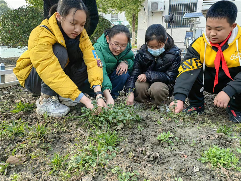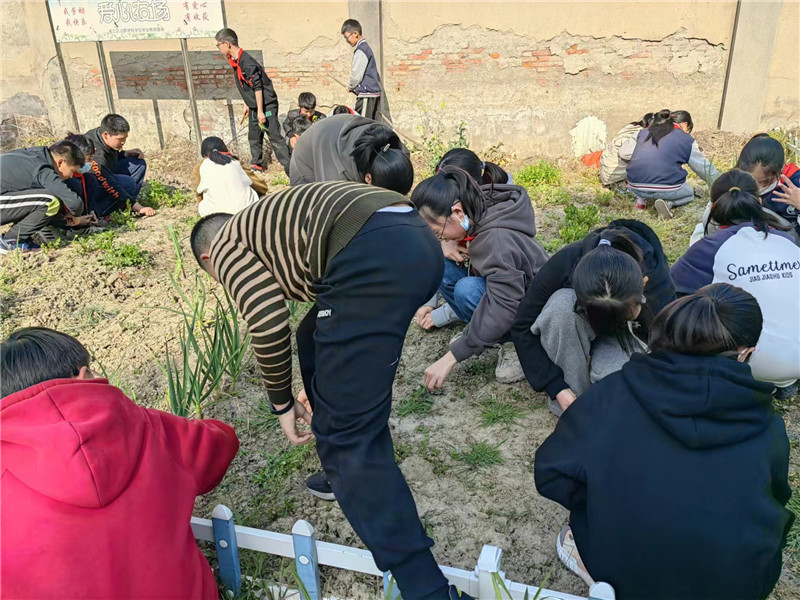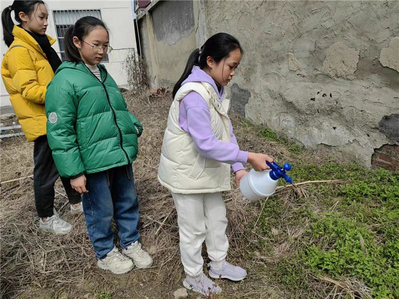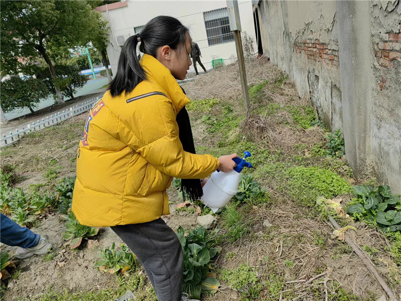 晓寒料峭,同学们已经开始了种植前的准备,拔草,仔细辨认杂草和蔬菜的区别。并且发现围墙周围杂草丛生,手动很难清除,同学们想出办法,建议用除草剂对墙角周边进行喷洒。