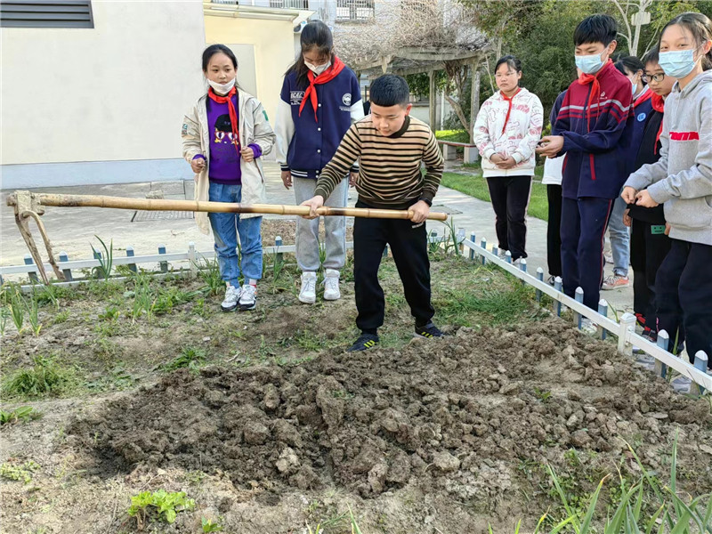 同学们再一次清除剩余的杂草,挥动锄头,翻地松土。