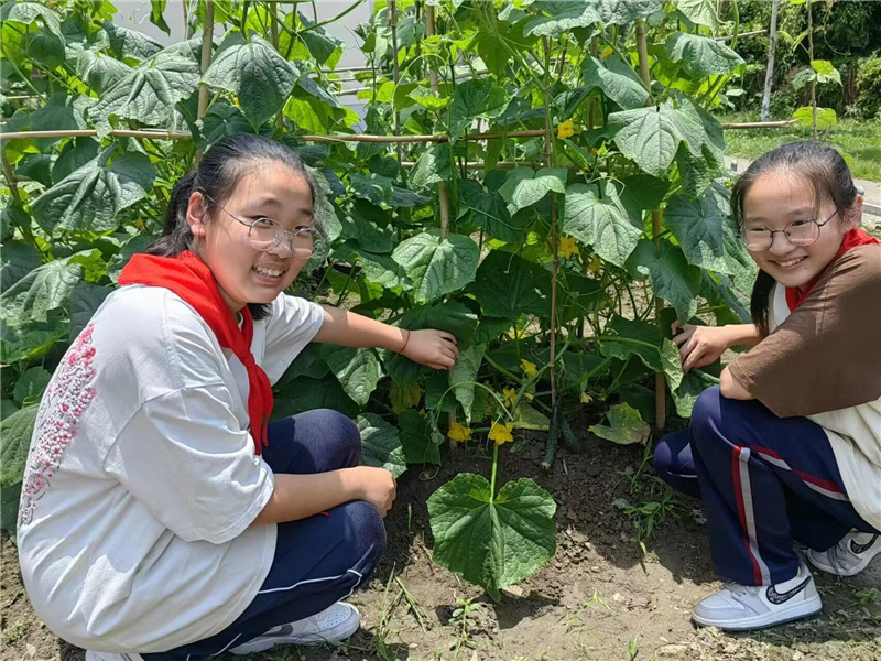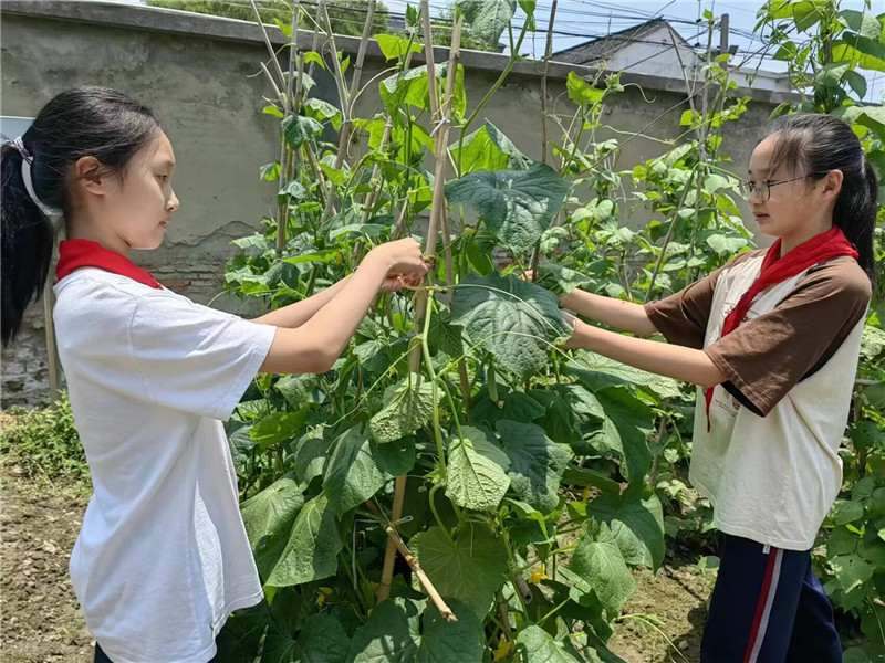 同学们对农场进行日常管理,除草,浇水,施肥,倪悦和潘子怡为黄瓜搭棚架。