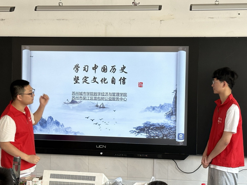 2023年7月4日,苏州城市学院“童心,童趣,童梦”暑期社会实践团队联合苏州市吴江区面包树公益服务中心,于吴江区震泽镇第二中心假日学校,开展“学习中国历史,坚定文化自信”主题教育活动,目的是继承和发扬中华优秀传统文化,凝聚起文化自信的磅礴力量。