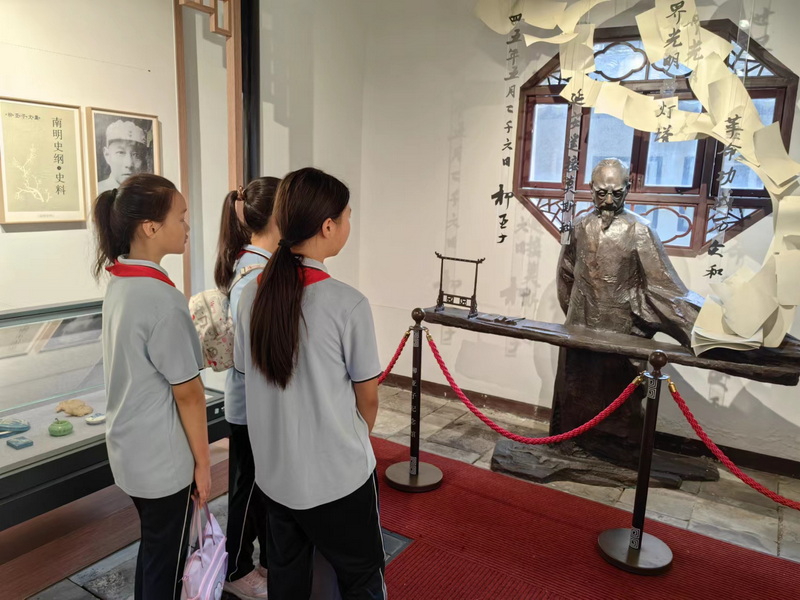 柳亚子纪念馆位于黎里古镇,馆内珍藏着柳亚子与南社方面的文物、藏品和资料,生动的图片和视频向同学们全面介绍了柳亚子先生的家族情况,也展示着柳亚子先生与中国共产党人携手同行、风雨同舟的革命历程。