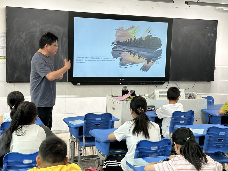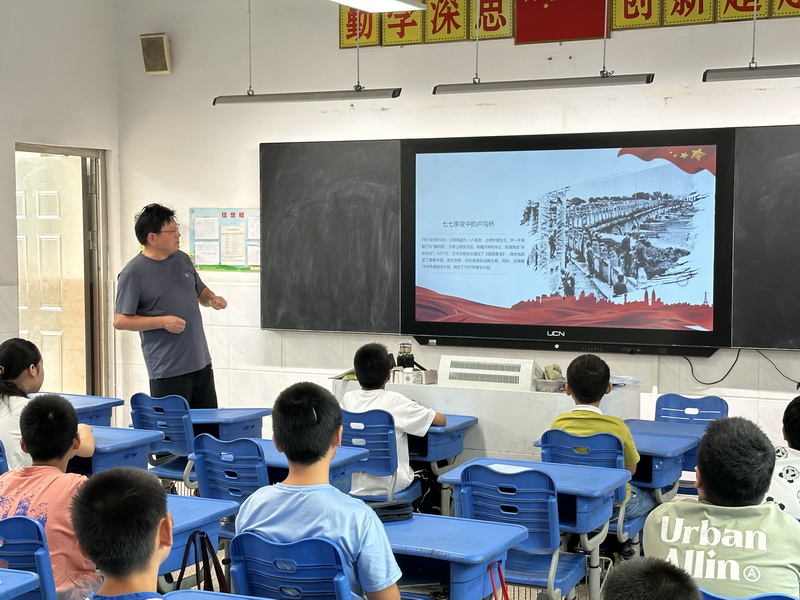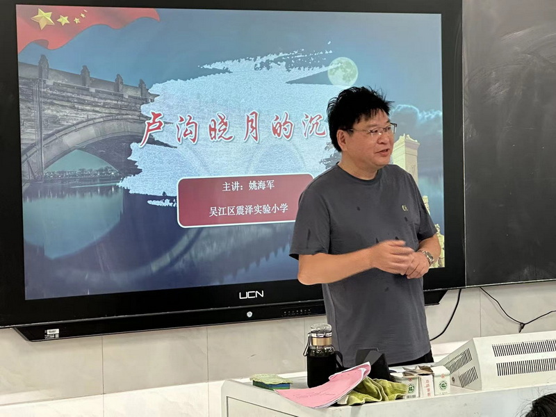 7月28日上午,震泽镇关工委的姚海军(震泽实验小学副校长)来到震泽镇第二中心假日学校,为孩子们带来了一场富有艺术气息的爱国主义教育讲座“卢沟晓月的沉思”。