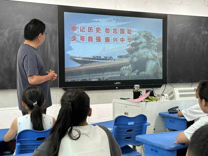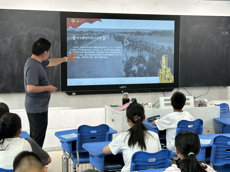 姚校长从当天的风声、雨声、读书声,进一步引导学生要关心“家事、国事、天下事”。从“牢记历史 勿忘国耻 少年自强 振兴中华”的讲座要点开始了生动的讲座。从一段歌剧视频展现了“九一八”后东北人民生活凄惨的画面,同学们被撕心裂肺的呼唤呐喊震撼了,了解了“九一八”事变后我国东北三省的人民水深火热的生活。从“卢沟晓月”的美丽照片到被日本人践踏的“卢沟桥事变”视频,同学们内心被触动了,感受到了“落后要挨打”的道理。姚校长的讲解抑扬顿挫,图片、影视频时时展示不同的内容,同学们仿佛身临其境一般。姚校长告诉同学们,习总书记在建党一百周年大会上的讲话中指出,中国人民是崇尚正义不畏强暴的人民。抗战十四年,不论在白山黑土的东北还是在中国的其他地区,中国共产党一直带领中国人民中国人民进行不屈不挠的斗争,最终取得了胜利。现在的中国,在中国共产党的带领下从站起来富起来到强起来,告诫同学们要趁现在努力学习,为祖国的强大贡献自己的一份力量。