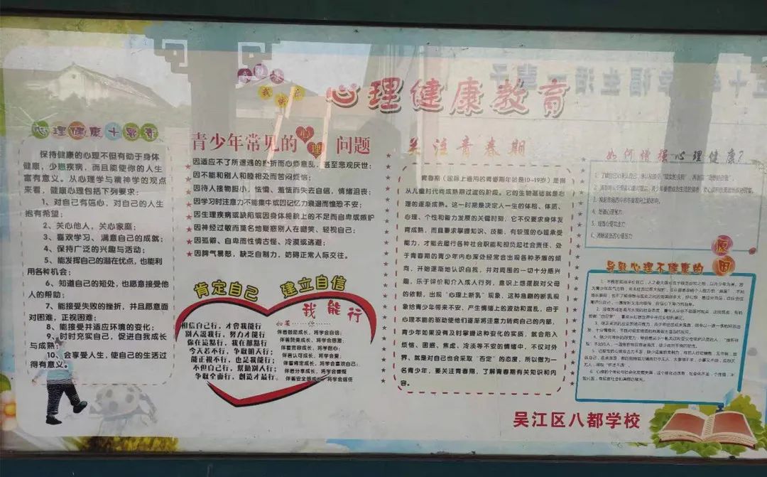 学生的心理健康是学生最大的财富,是促进学生全面发展的重要保障,是校园安全的基石,为了加强校园文化建设,深化学生心理健康教育工作,提高学生心理素质,促进学生人格健康成长,预防心理危机事件发生,八都学校充分利用现有的阵地宣传和普及心理健康知识。通过国旗下讲话、主题橱窗、横幅等形式积极宣传心理健康知识。让全体师生在学习、生活中随时保持正常的心态,学会用心去感知心灵的温度,感受生命的美好,心向阳光,健康成长。