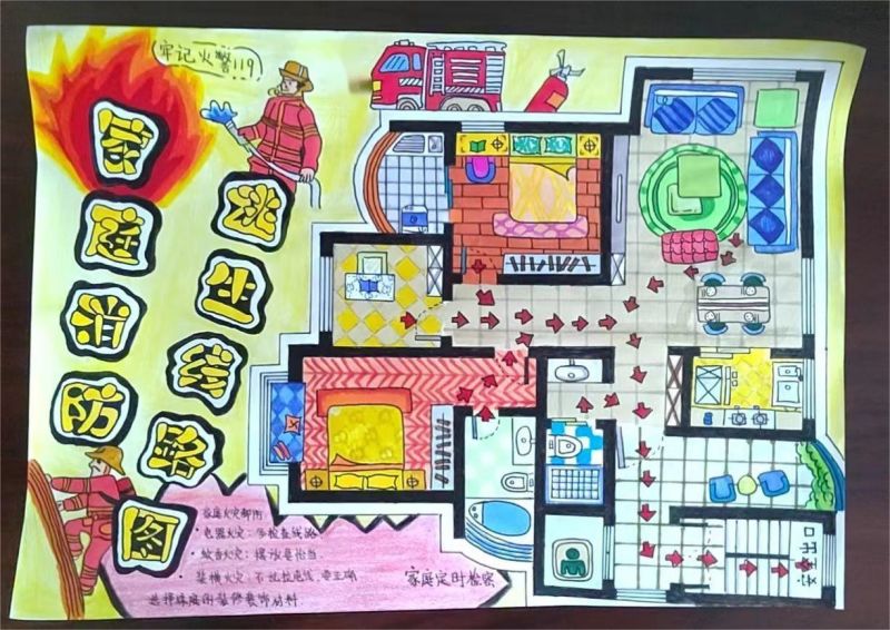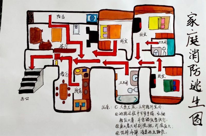 同学们充分运用手中的画笔,根据各自家庭布局实际情况,假想家中各个不同的着火地点,将一幅幅消防疏散逃生路线图跃然纸上。简单的方式、绚烂的色彩展示着同学们对消防的认知。