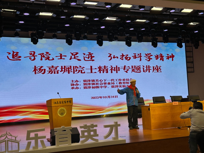 习近平总书记在党的二十大报告中指出:“教育、科技、人才是全面建设社会主义现代化国家的基础性、战略性支撑。”为传承和发扬“两弹一星”元勋杨嘉墀院士的科学家精神,涵养优良学风,培养中小学生对科学探索的兴趣,10月24日,由震泽镇关工委主办,震泽镇社会事业局(教育组)协办,震泽初级中学、震泽实验小学共同承办的“追寻院士足迹 弘扬科学精神——杨嘉墀院士精神专题讲座”在震泽初级中学举行。我校学生代表在赵明卫老师的带领下全程参与了活动。