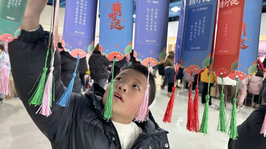 同学们走出家门,漫步花街看灯笼高高挂起,参与猜字谜游戏,感受祥和、喜庆热闹的元宵节氛围。