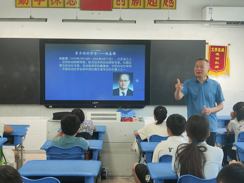 姚建忠原来是八都小学的支部书记,对学生的思想教育相当重视,这次来也是提前制作了精美的APP,搜集了相当多的素材。姚书记从中国古代的科学家到中国的四大发明,从近代科学家到两弹一星元勋科学家,最后到家乡的科学家,重点讲了从震泽走出去的两弹一星科学家杨嘉墀院士。