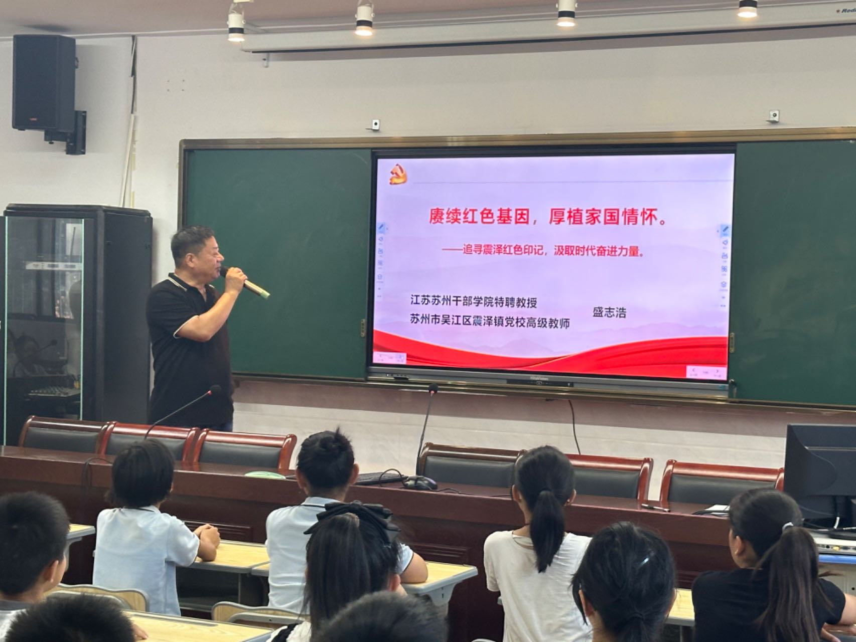 七月八日上午,震泽镇关工委育英园讲师团的盛志浩校长来到震泽镇第二中心假日学校,为全体学生奉献了一场名为《赓续红色基因,厚植家国情怀。——追寻震泽红色印记,汲取时代奋进力量。》的精彩讲座。