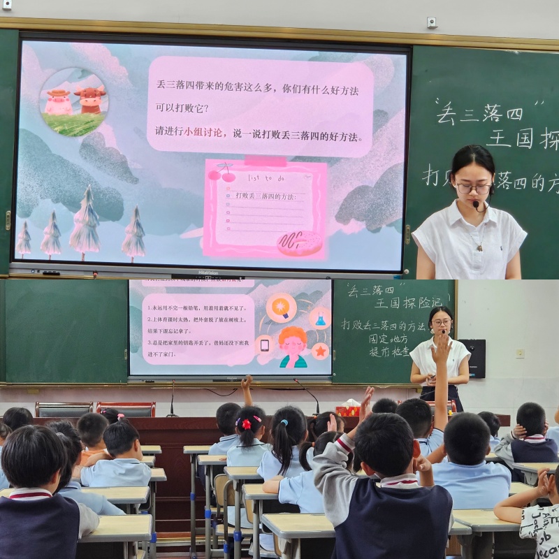 面对丢三落四这个“小怪兽”,如何才能战胜它呢?在“战胜丢三落四”板块,同学们展开热烈讨论,大家你一言我一语,想出了许多实用的好办法,如睡前整理好书包、制作备忘录、给物品分类摆放等。老师对同学们的想法给予充分肯定,并引导大家将这些方法运用到实际生活中。