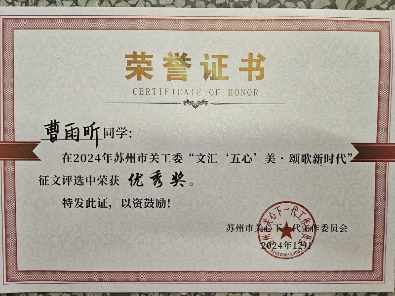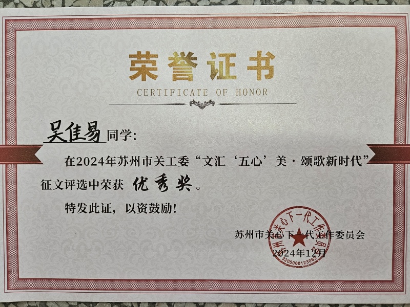 喜报:五(3)班曹雨昕、六(5)班吴佳易在2024年苏州市关工委“文汇‘五心’美·颂歌新时代”征文评选中荣获优秀奖。
