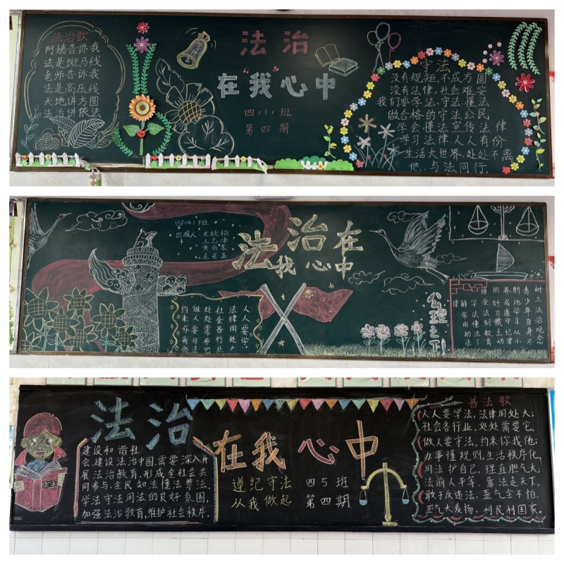 为营造浓厚的法治宣传氛围,学校组织开展了“法治在我心中”黑板报评比活动。各班级充分发挥创意,将法治知识与艺术表现相结合,制作出了一幅幅主题鲜明、内容丰富的黑板报。这些黑板报不仅色彩鲜艳、设计精美,更以直观的方式传播了法治理念,成为校园里一道亮丽的法治风景线。