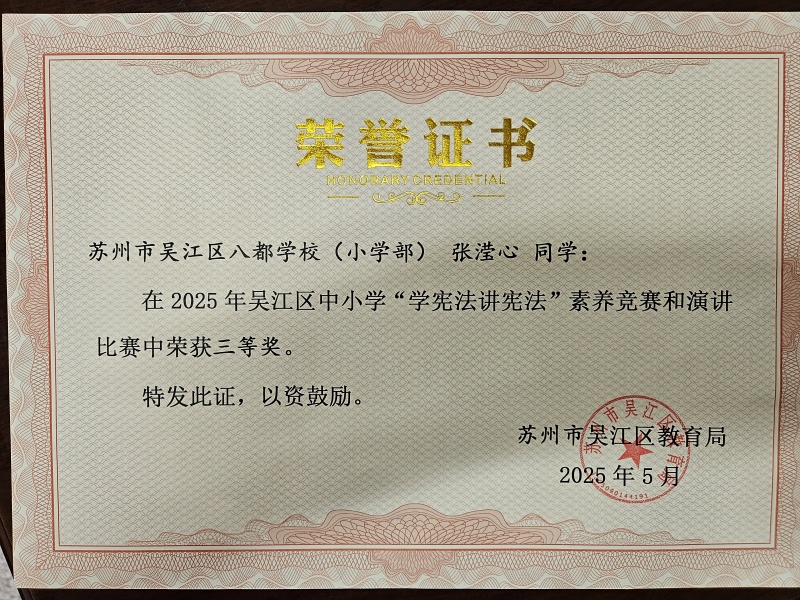 5)班张滢心同学在2025年吴江区“学宪法讲宪法”素养竞赛和演讲比赛中荣获三等奖。