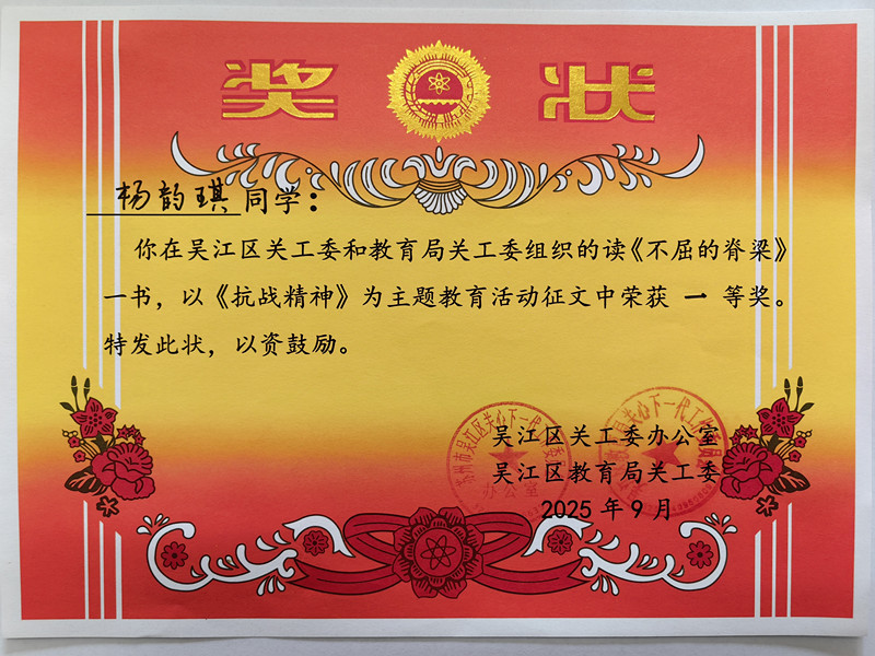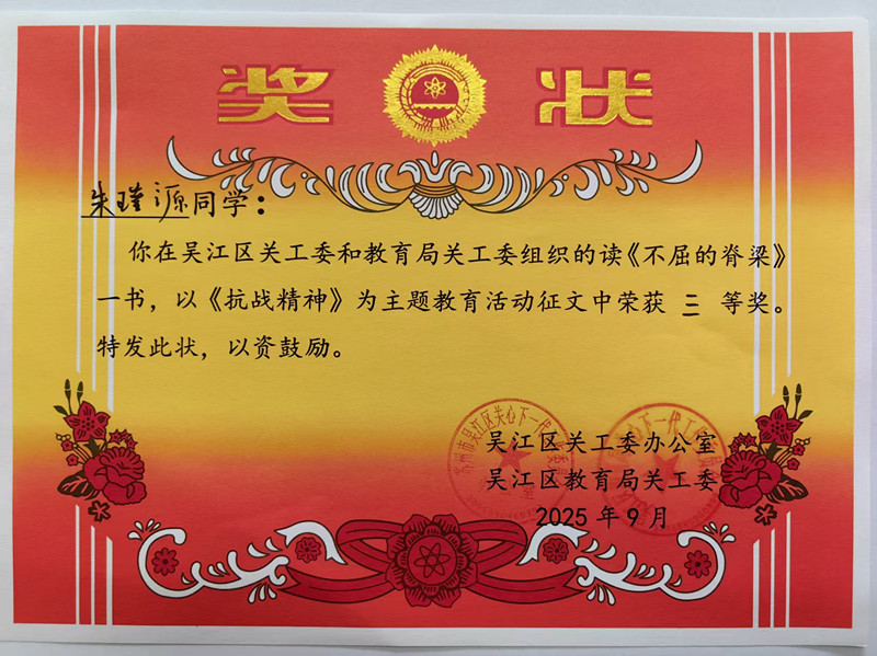 朱瑾源在吴江区关工委组织的读《不屈的脊梁》征文活动中分别荣获一等奖、三等奖。
